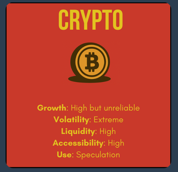 Cryptocurrency (like Bitcoin or Ethereum) is a digital form of money, built on blockchain tech. Some see it as the future of finance. Others see it as digital gambling. Either way - it’s the most speculative asset in the deck.