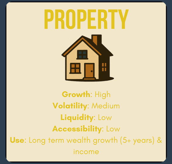 Property is one of the most familiar assets - bricks and mortar. You can live in it, rent it out, or sell it later. It can create capital growth (the price) and income (rent), but it’s far from passive.