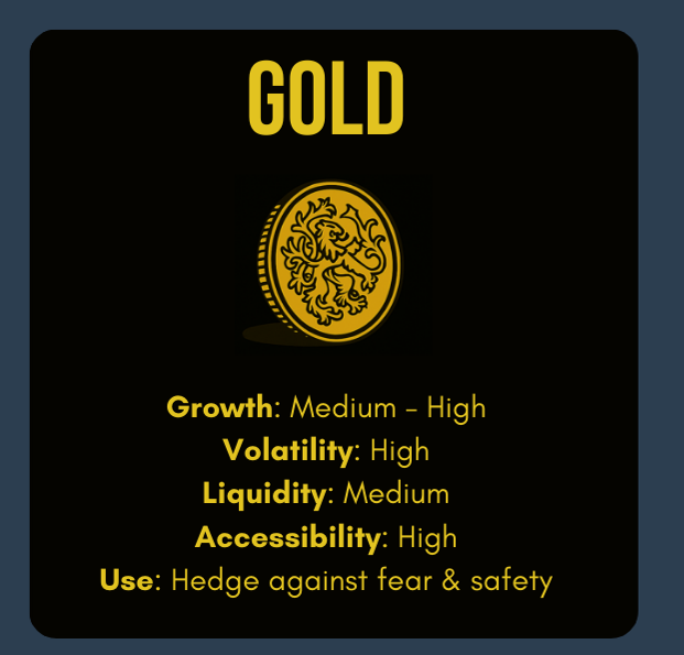 Gold is the OG asset - prized for thousands of years. It's not about income or growth. It's about stability and fear insurance.