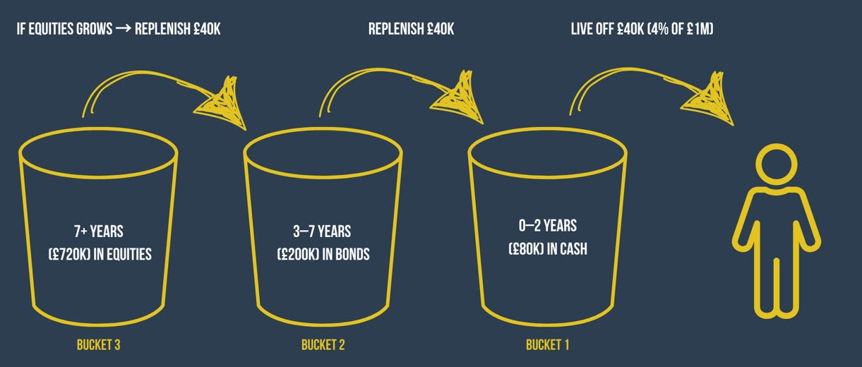 A three-bucket approach divides a portfolio based on time horizons. Because many retirees follow a 3–4 % safe withdrawal rate, we’ll illustrate this with a £1m portfolio, where 4% → £40k.