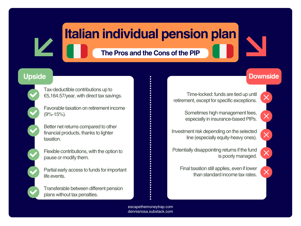 The Individual Pension Plan is one of the best options in Italy for building a complementary pension, especially for younger people or those with medium to high incomes. When used wisely, it can provide significant tax savings today and greater peace of mind tomorrow.