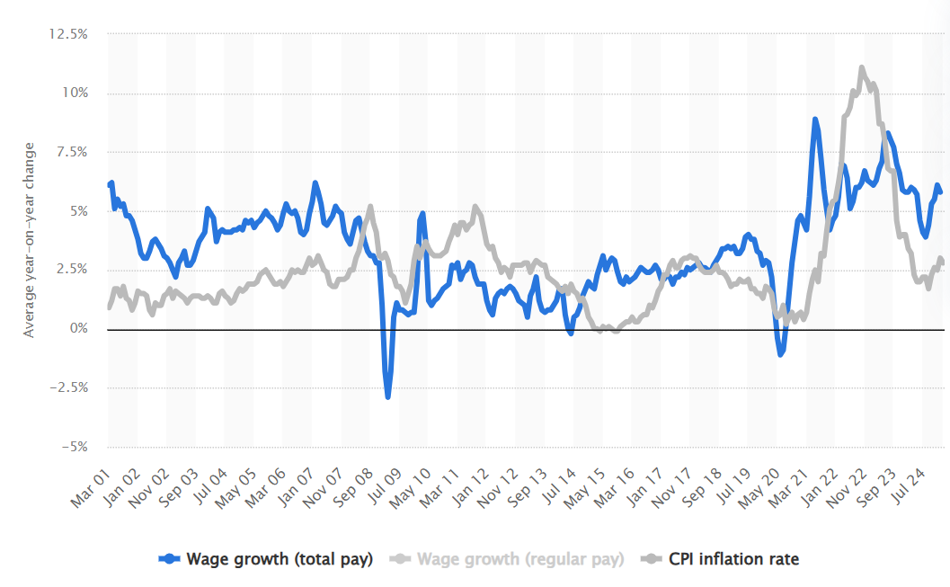 This graph shows the rise of prices (CPI inflation rate, grey) compared to changes in pay (wage growth, blue).
